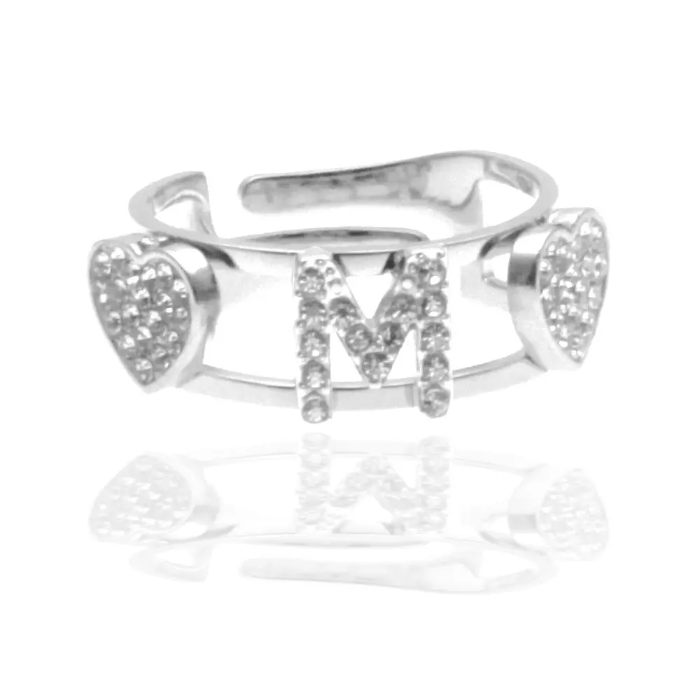 Anello con inziale m in acciaio e strass con cuoricini misura unica aperto all0081