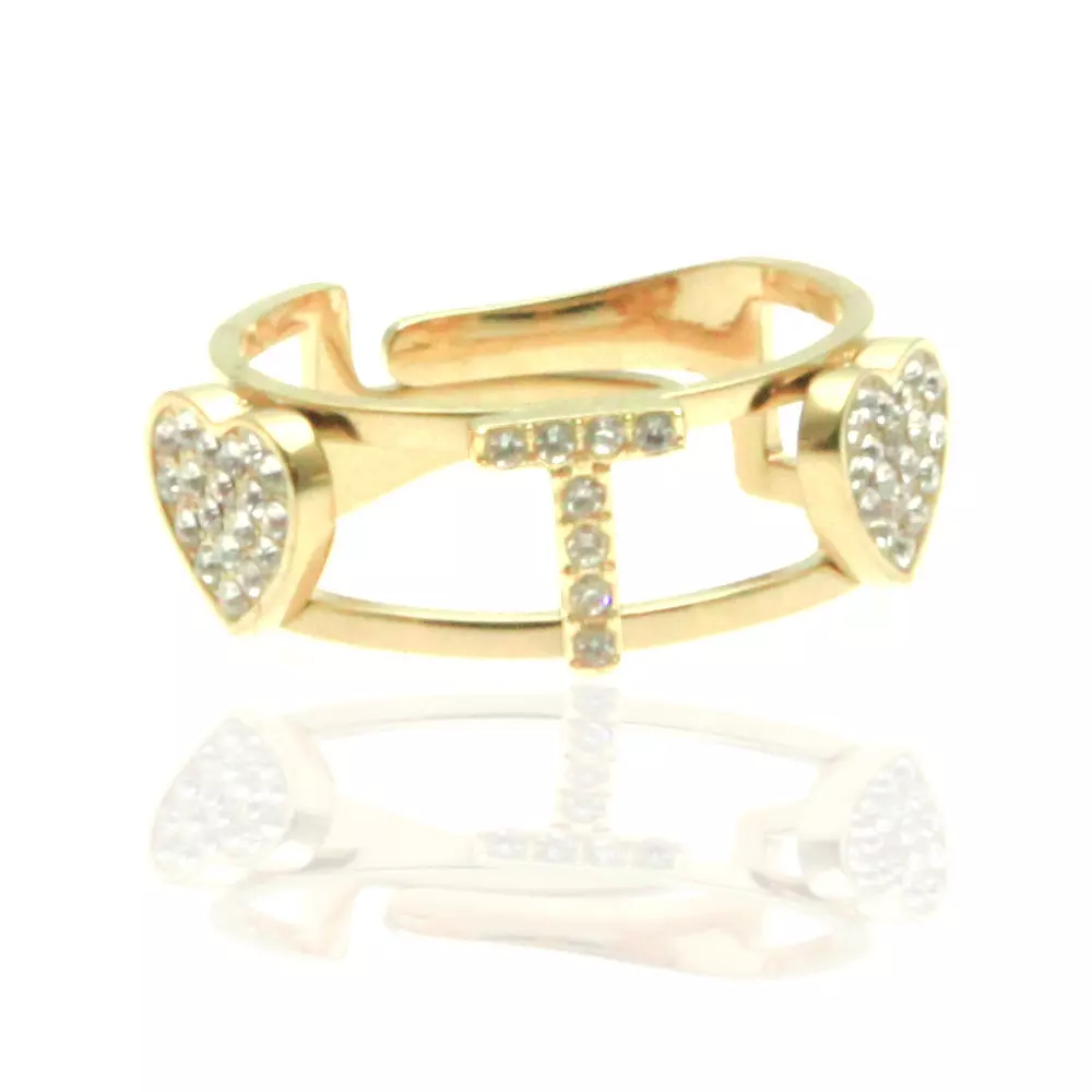 Anello con lettera t in acciaio dorato e strass con cuoricini misura unica aperto all0102
