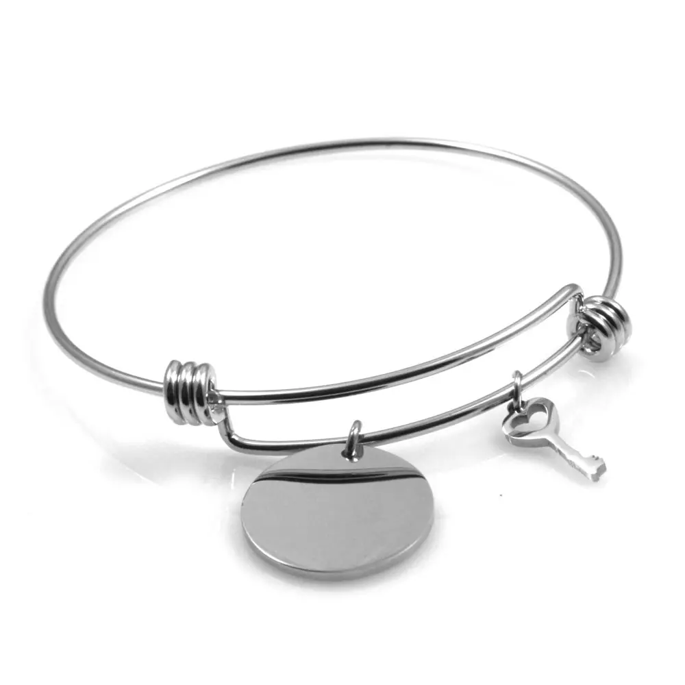 Bracciale rigido donna con ciondolo tondo e chiave in acciaio possibilità di personalizzazione sul fronte e sul retro misura unica pendente mm 20 bcc2363