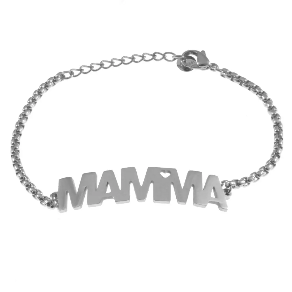 bracciale con scritta mamma in acciaio catena a coda di topo lungo cm 19 alto mm 10 bcc2523