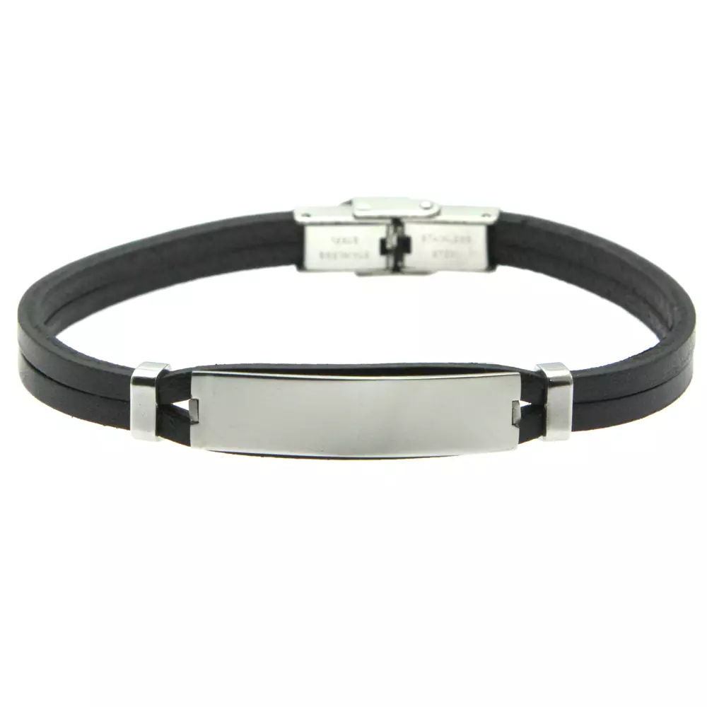 Bracciale uomo pelle nera piastra in acciaio con possibilità di essere personalizzato con incisione sul fronte e sul retro lungo cm 21 largo mm 10 bcc0458