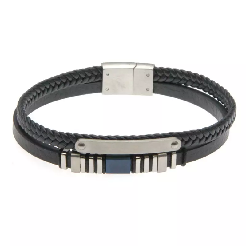 Bracciale uomo pelle piastrina acciaio satinata elementi blu possibilità di essere personalizzato con incisione sul fronte lungo cm 21 largo mm 12 bcc0145
