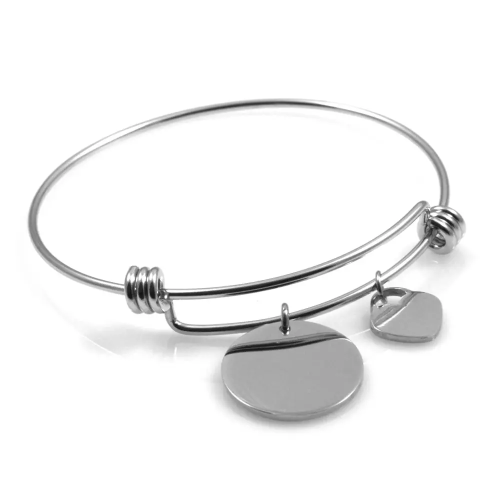 Bracciale rigido donna con ciondolo tondo e cuore in acciaio possibilità di personalizzazione sul fronte e sul retro misura unica pendente mm 20 bcc2362