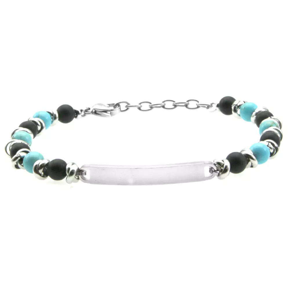 Bracciale uomo pietre piastra acciaio colore nero e turchese possibilità di personalizzazione con incisione sul fronte e sul retro lungo cm 21 largo mm 5