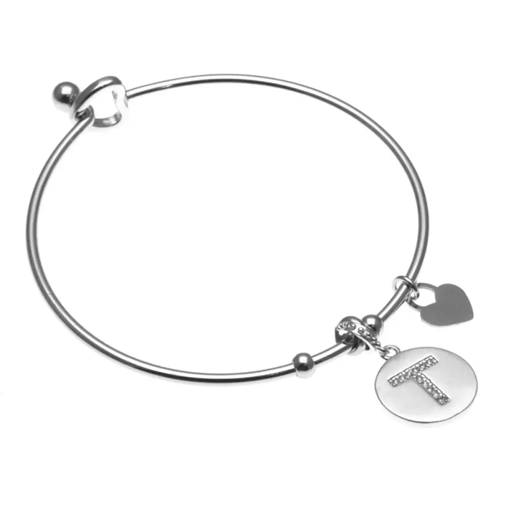 bracciale con iniziale t rigido in acciaio e strass diametro cm 6 pendente mm 15 bria0018