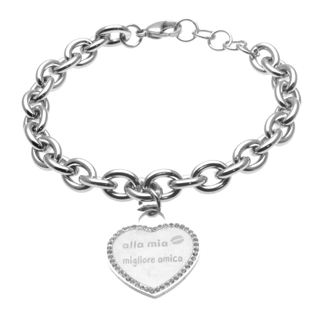 bracciale amica amicizia con cuore e frase acciaio e strass personalizzabile con incisione sul retro catena forzatina fino a cm 20 ciondolo mm 25 bcc2828