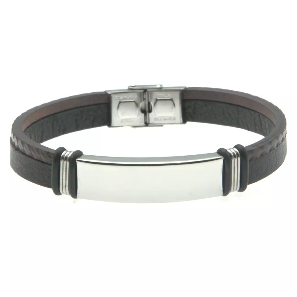 Bracciale uomo pelle nera e marrone piastra in acciaio possibilità di personalizzazione con incisione sul fronte lungo cm 21 largo mm 11