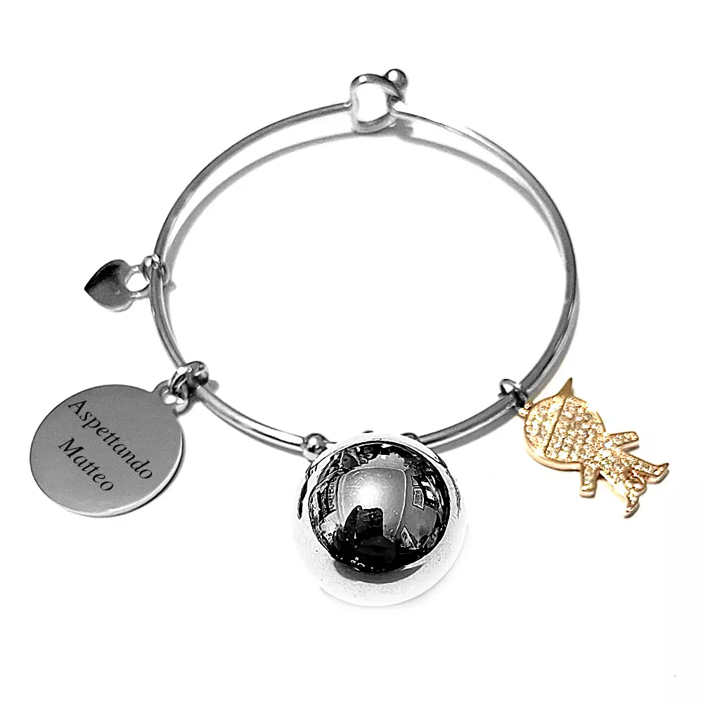 chiama angeli bracciale con bebè bimbo bambino in acciaio e strass con ciondolo personalizzabile con incisione misura unica rigido diametro cm 6 sfera cm 2 bcc2747