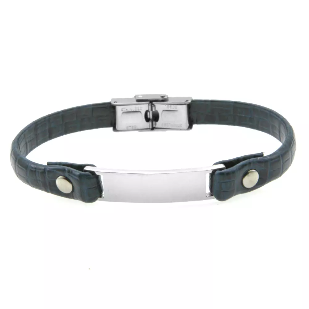 Bracciale uomo pelle blu piastra in acciaio possibilità di personalizzazione con incisione sul fronte e sul retro lungo cm 21 largo mm 10 bcc0463