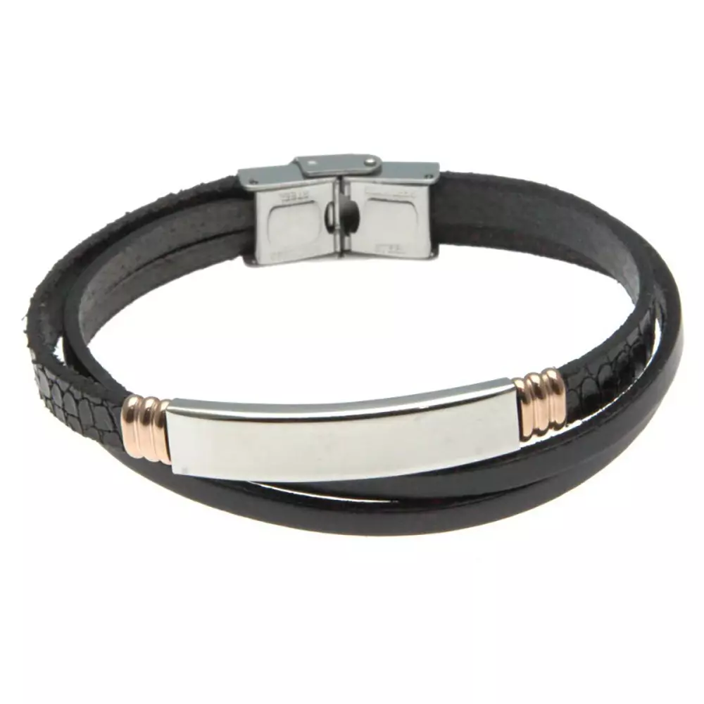 Bracciale uomo pelle multifilo nera piastra acciaio elementi ramati possibilità di essere personalizzato con incisione sul fronte lungo cm 21 largo mm 12 bcc1845