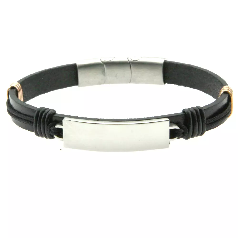 Bracciale uomo pelle piastra acciaio elementi neri e ramati possibilità di essere personalizzato con incisione sul fronte lungo cm 21 largo mm 10 bcc0471
