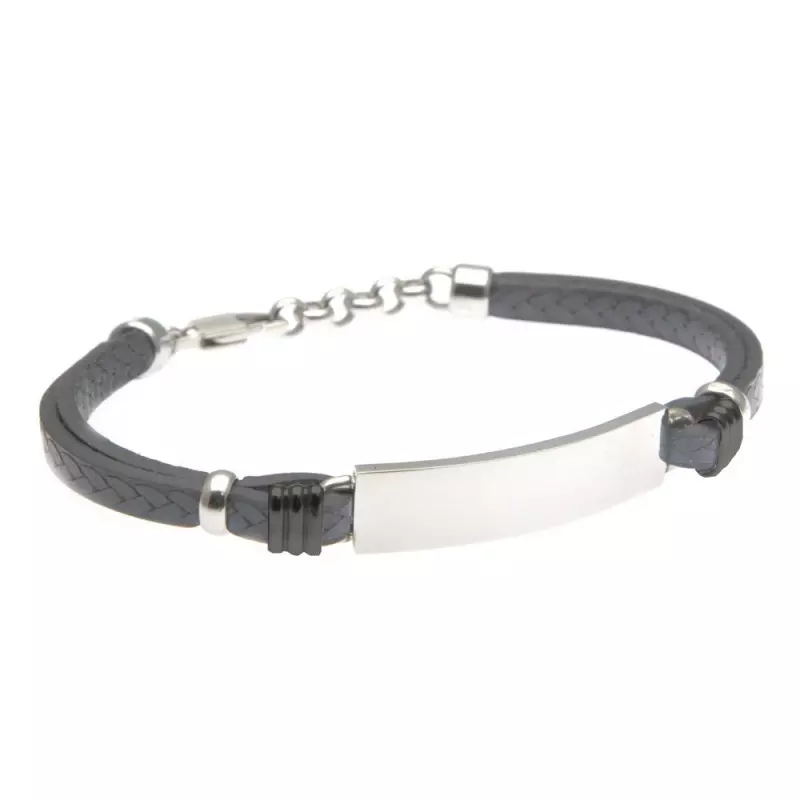 Bracciale uomo pelle blu pitonata piastra acciaio elementi neri possibilità di essere personalizzato con incisione sul fronte e sul retro lungo cm 21 largo mm 10 bcc2083