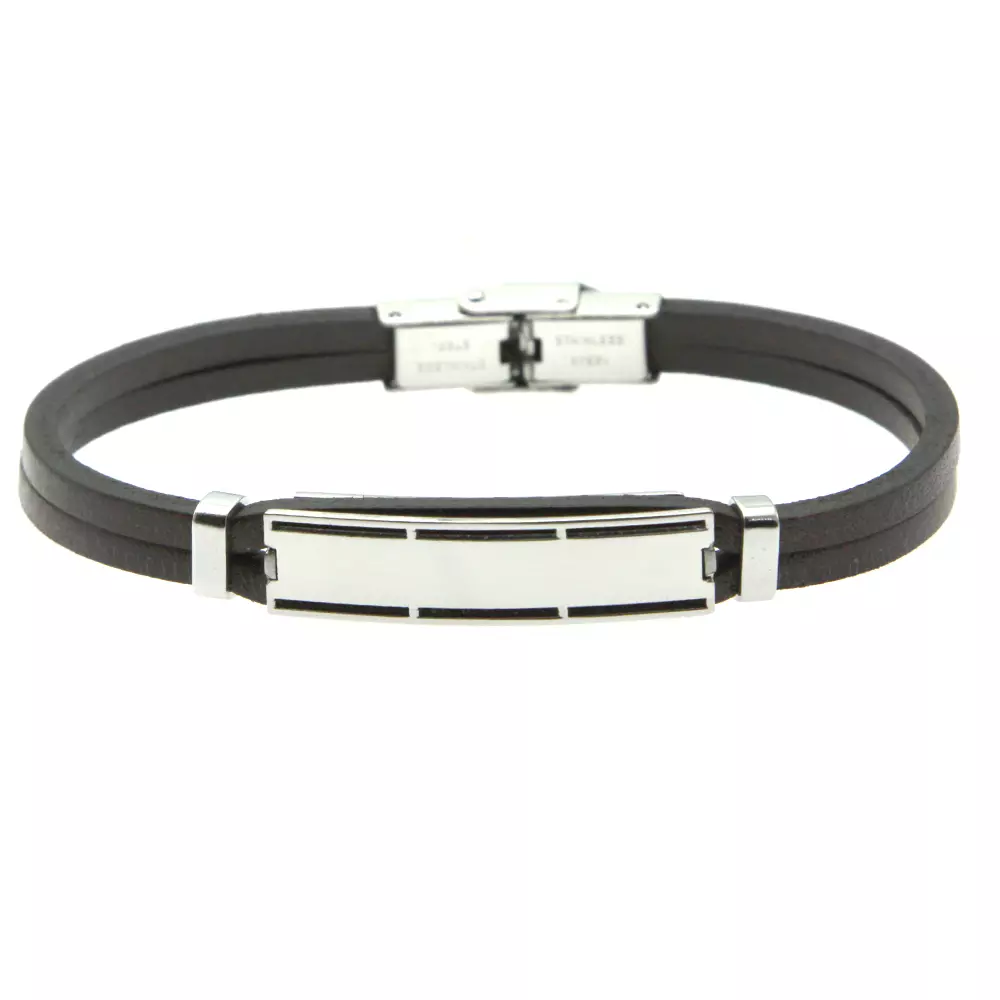 Bracciale uomo pelle marrone piastra in acciaio con possibilità di essere personalizzato con incisione sul fronte e sul retro lungo cm 21 largo mm 10 bcc0457
