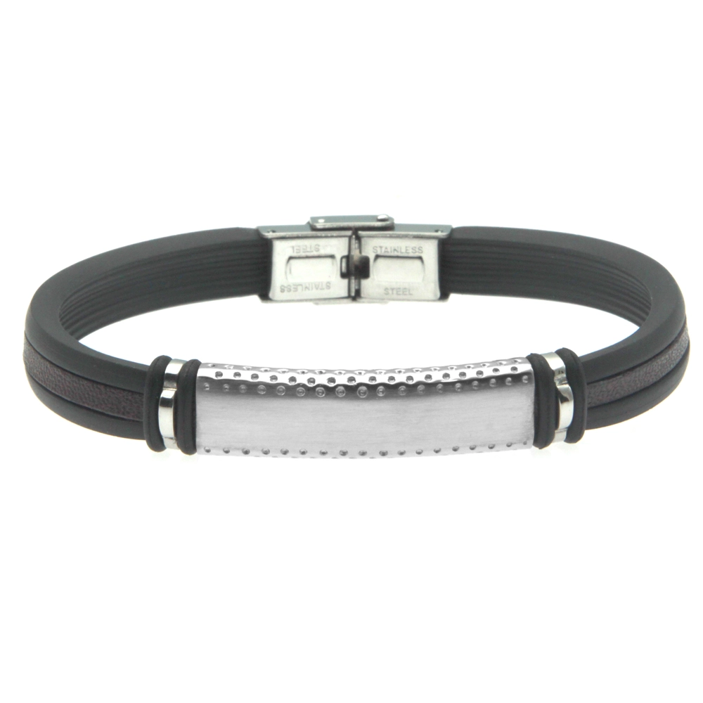 bracciale uomo con piastra in acciaio cinturino in caucciù e pelle personalizzabile con incisione sul fronte e sul retro lungo cm 21 largo mm 10 facile da accorciare