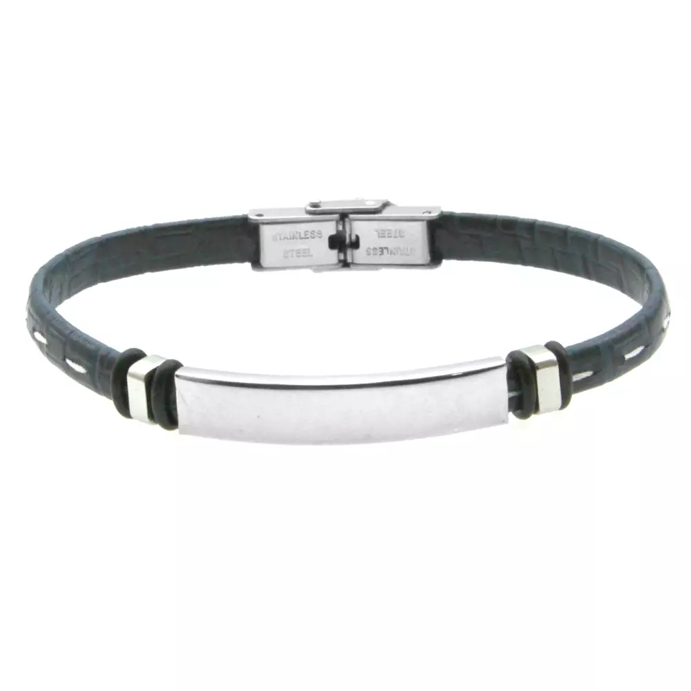 Bracciale uomo pelle blu pitonata trapuntata piastra in acciaio con possibilità di essere personalizzato con incisione sul fronte lungo cm 21 largo mm 7 bcc2325