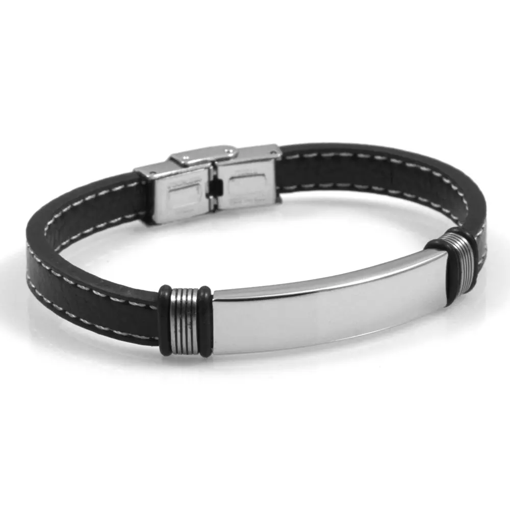 Bracciale uomo pelle nera trapuntata piastra in acciaio possibilità di essere personalizzato con incisione sul fronte lungo cm 21 largo mm 9 bcc2329
