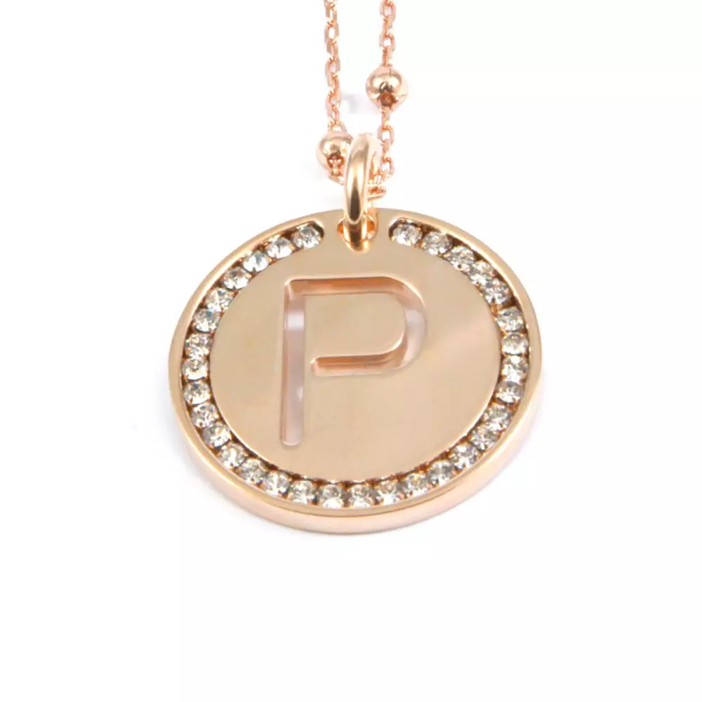 collana con lettera p in bronzo ramato e strass catena fino a cm 90 pendente diametro cm 3 clib0042