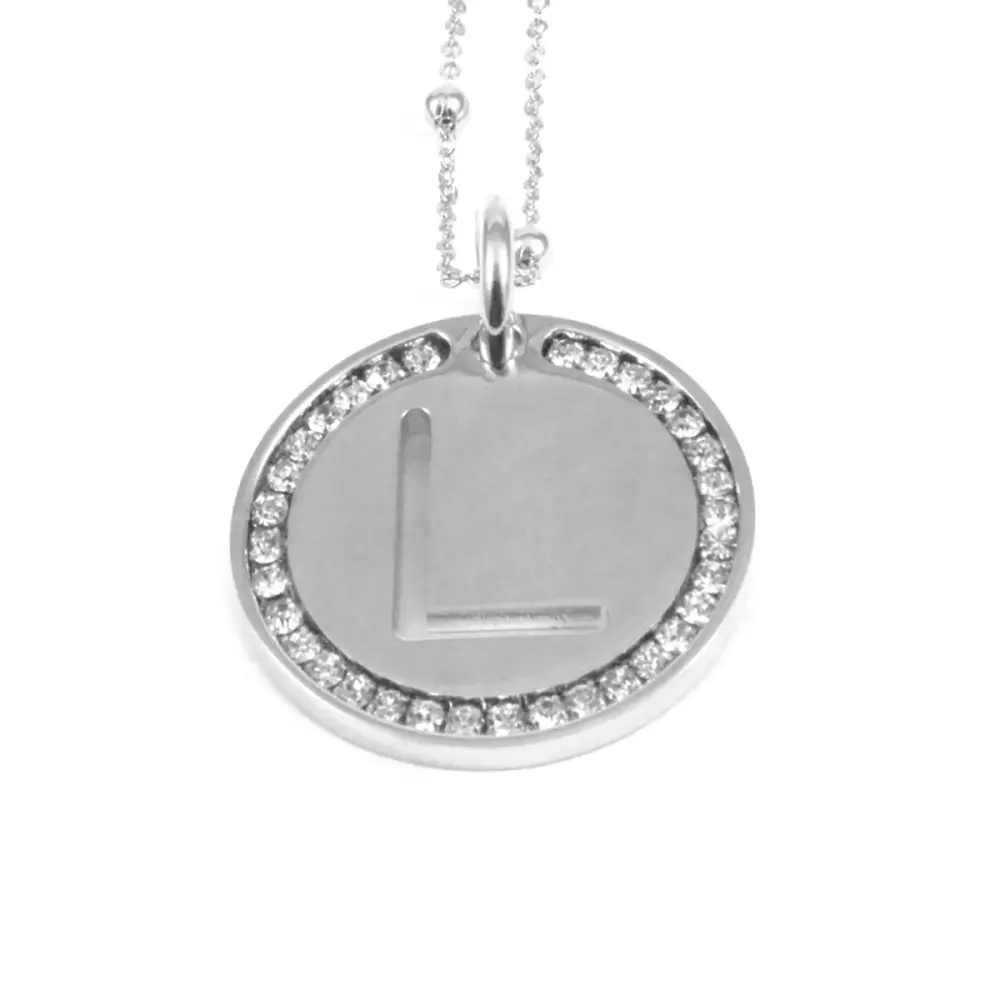 collana con lettera l in bronzo e strass catena fino a cm 90 pendente diametro cm 3 clib0031