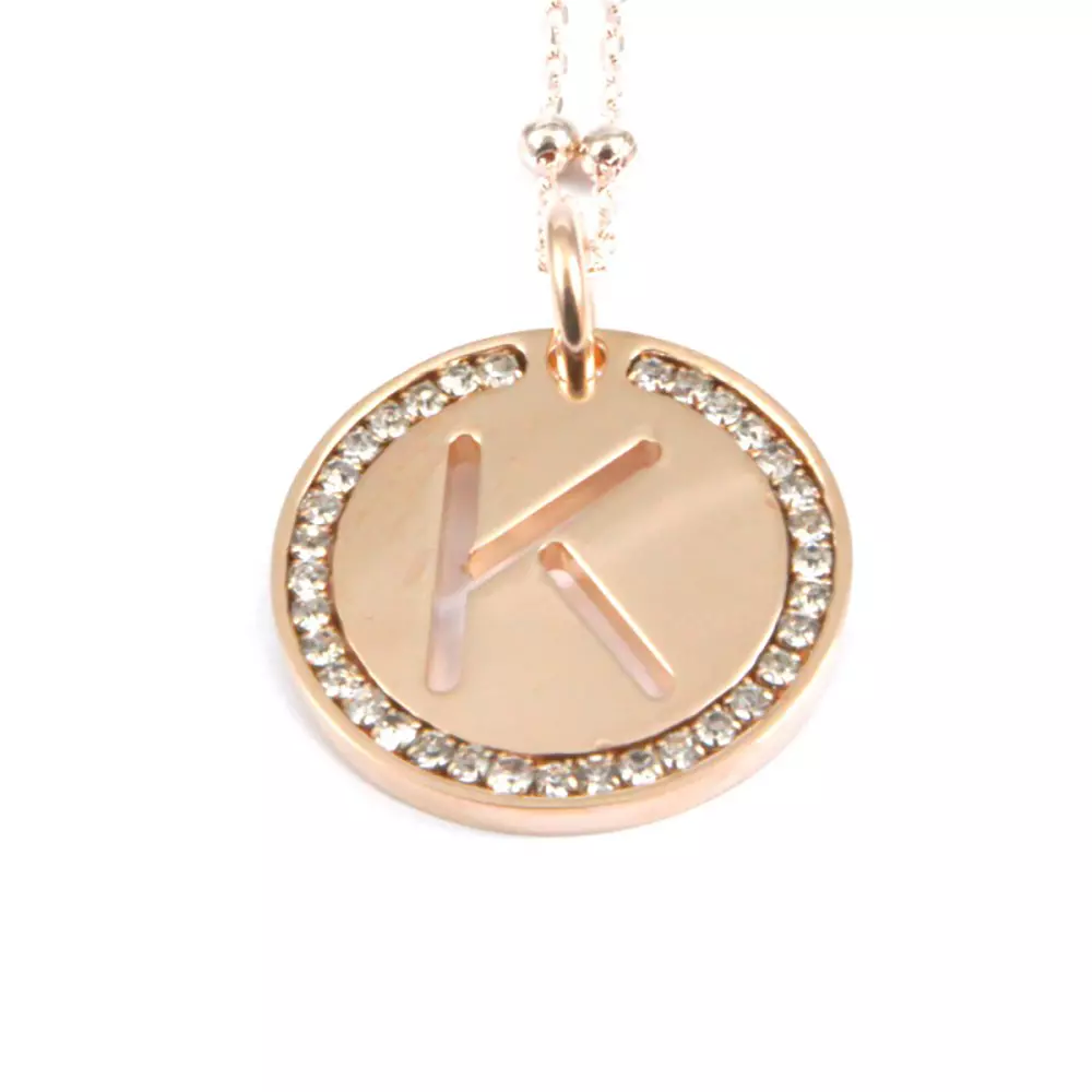 collana con lettera k in bronzo ramato e strass catena fino a cm 90 pendente diametro cm 3 clib0030