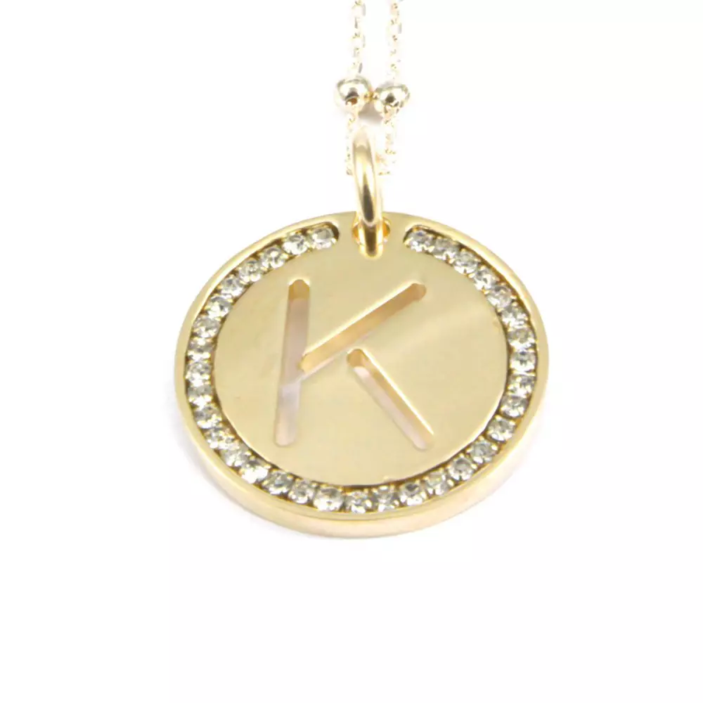 collana con lettera k in bronzo dorato e strass catena fino a cm 90 pendente diametro cm 3 clib0029