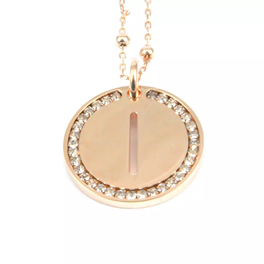 collana con lettera i in bronzo ramato e strass catena fino a cm 90 pendente diametro cm 3 clib0024