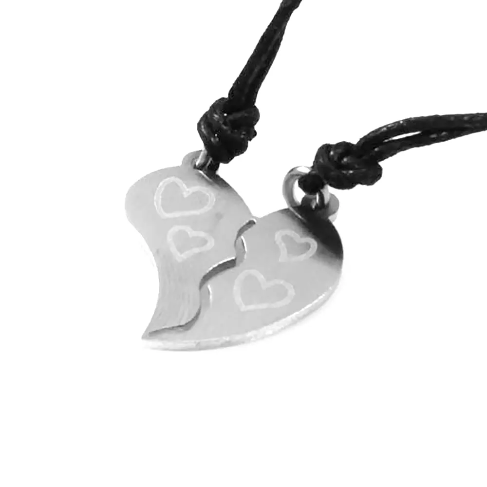 collana coppia fidanzati cuore spezzato in acciaio e laccetti neri da cm 50 misura intero pendente mm 25 mm 22 cll1145