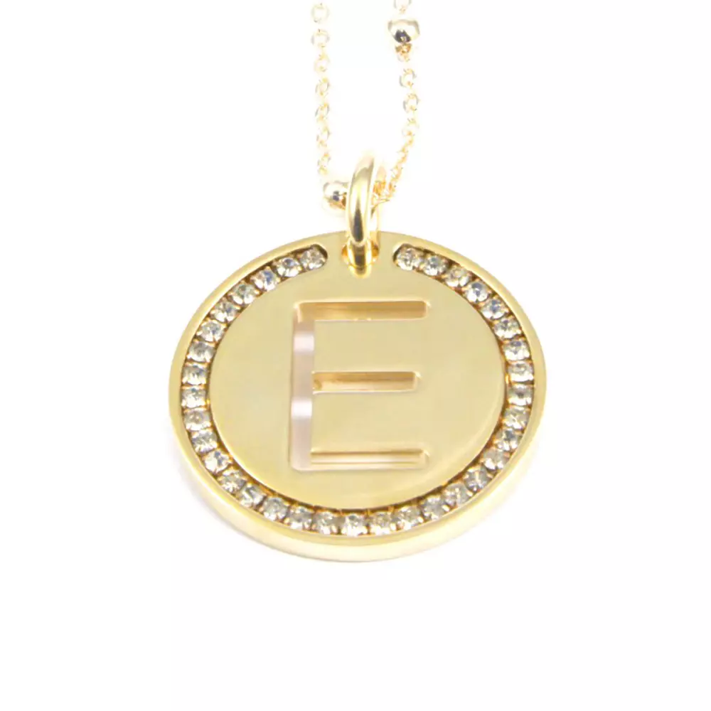 collana con lettera e in bronzo dorato e strass catena fino a cm 90 pendente diametro cm 3 clib0014