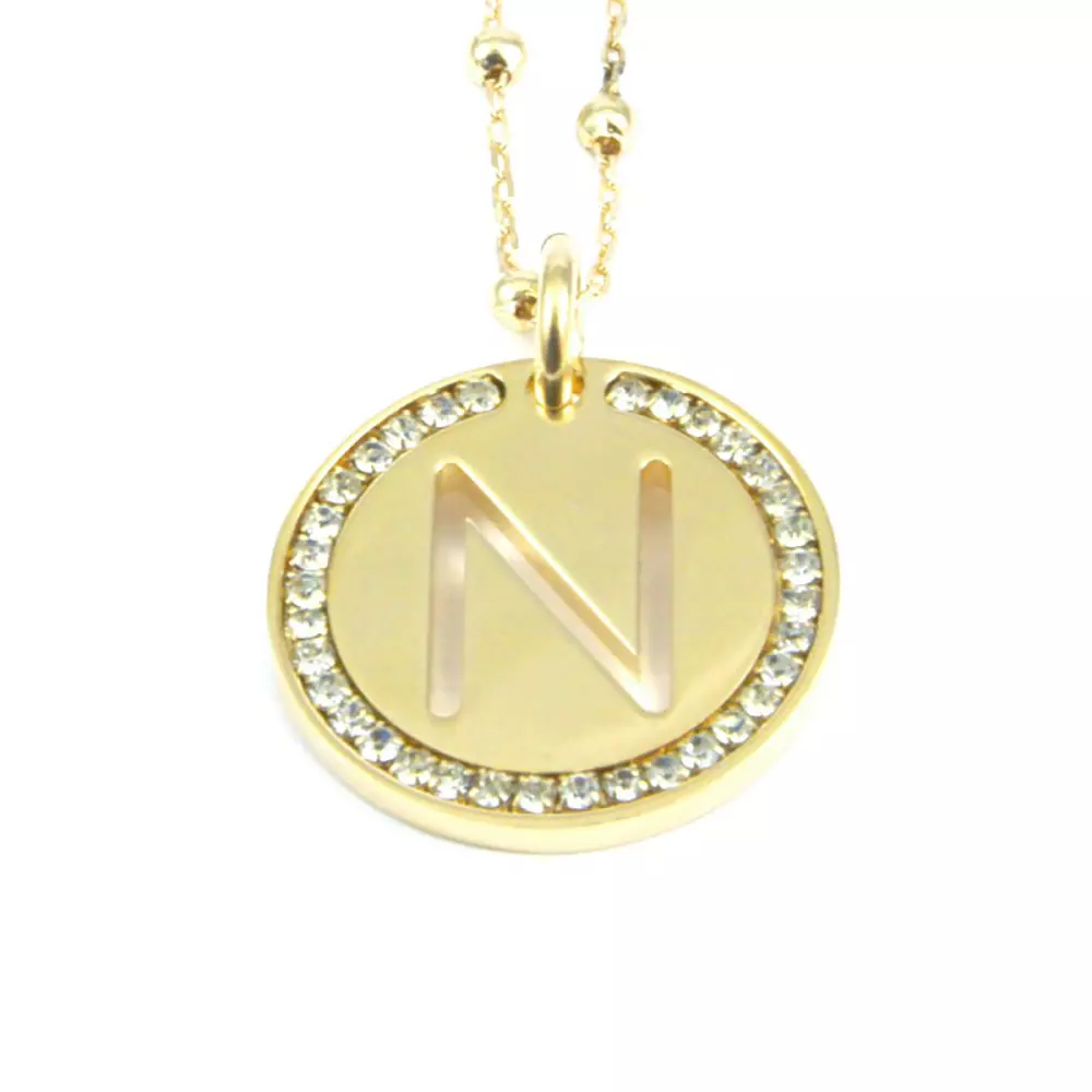 collana con lettera n in bronzo dorato e strass catena fino a cm 90 pendente diametro cm 3 clib0038