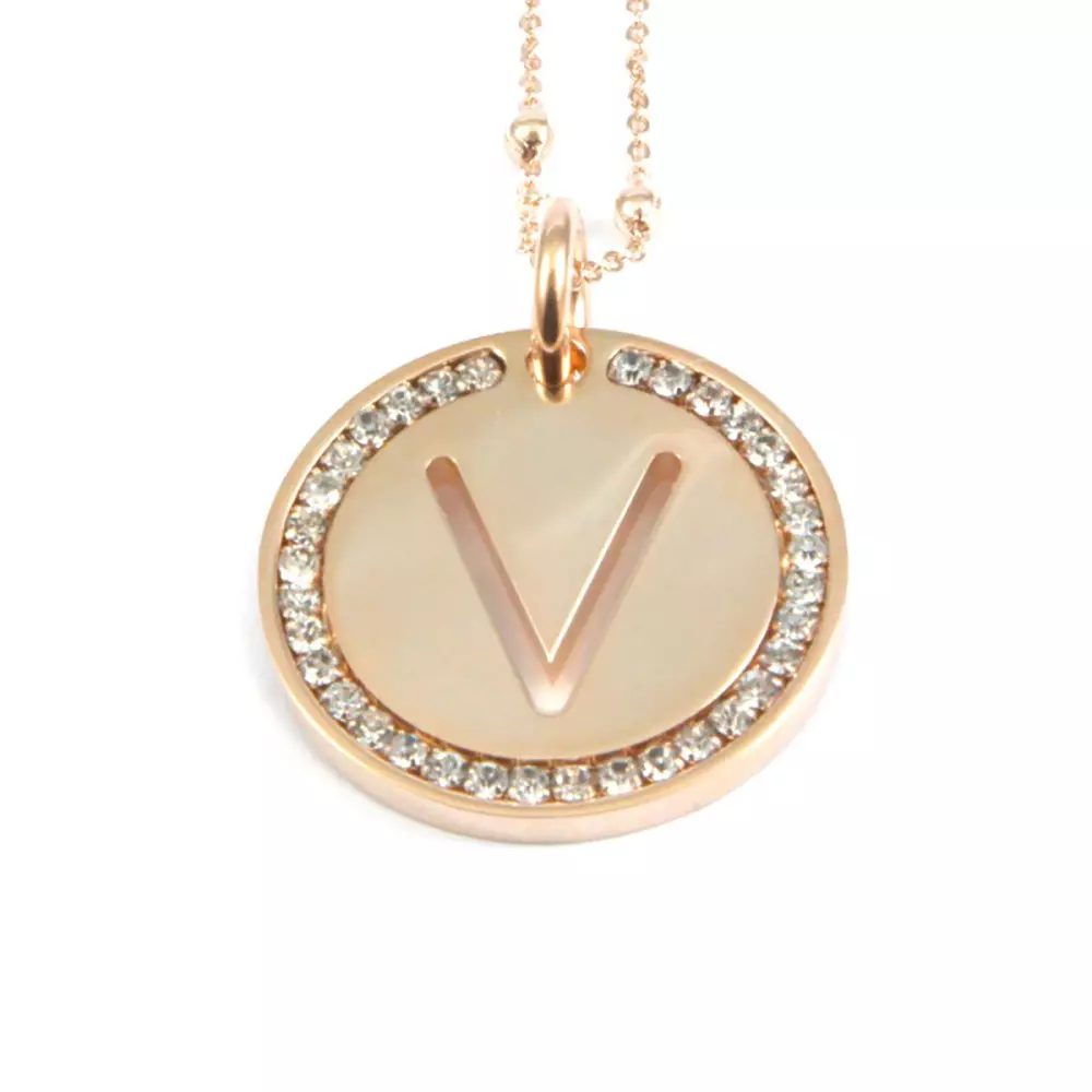 collana con lettera v in bronzo ramato e strass catena fino a cm 90 pendente diametro cm 3 clib0054