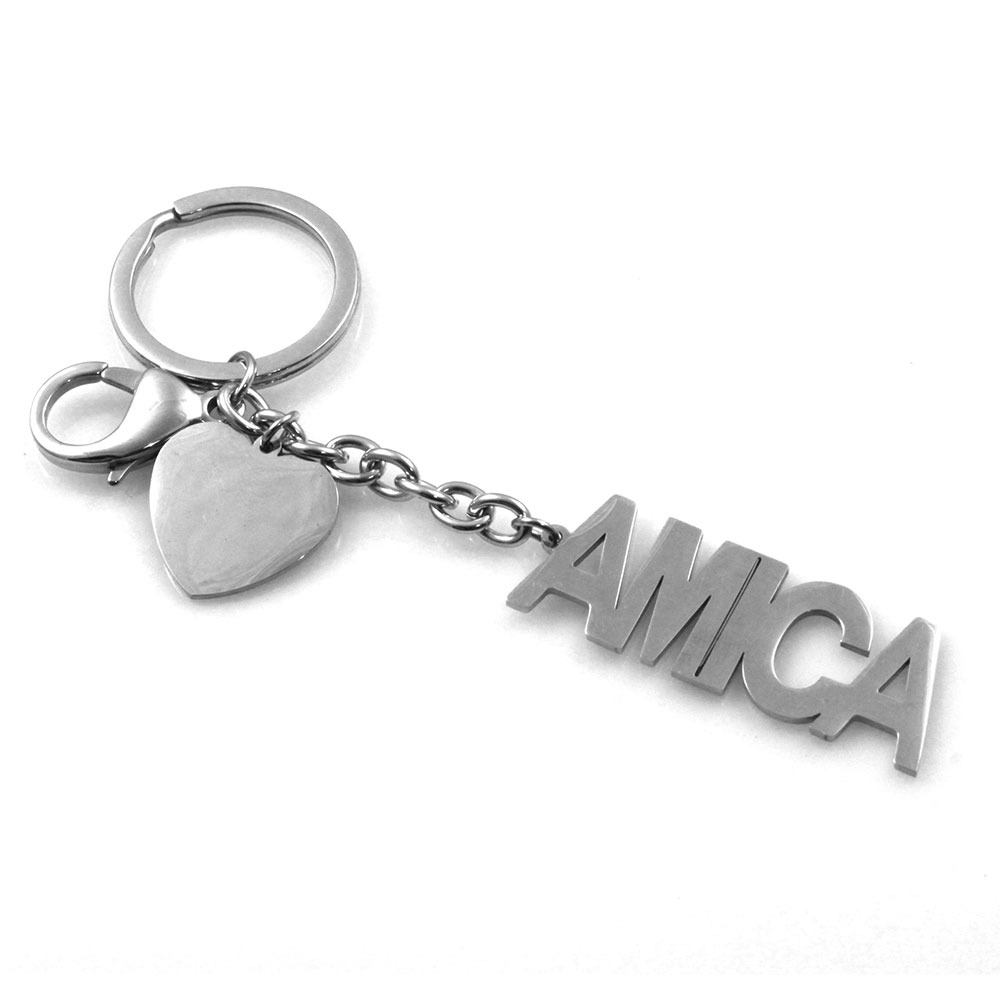 portachiavi amica con scritta in acciaio possibilità di personalizzazione con incisione del cuore sul fronte o sul retro misure cm 12 mm 18 prt0230