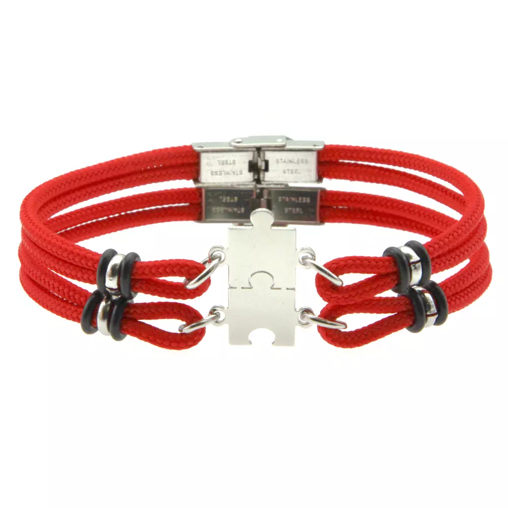 Bracciali puzzle coppia e fidanzati in acciaio e cordoncino colorato rosso possibilità di personalizzazione sul fronte e sul retro misura lui cm 21 lei cm 19 pendente intero mm 24 mm 12 bcc2440